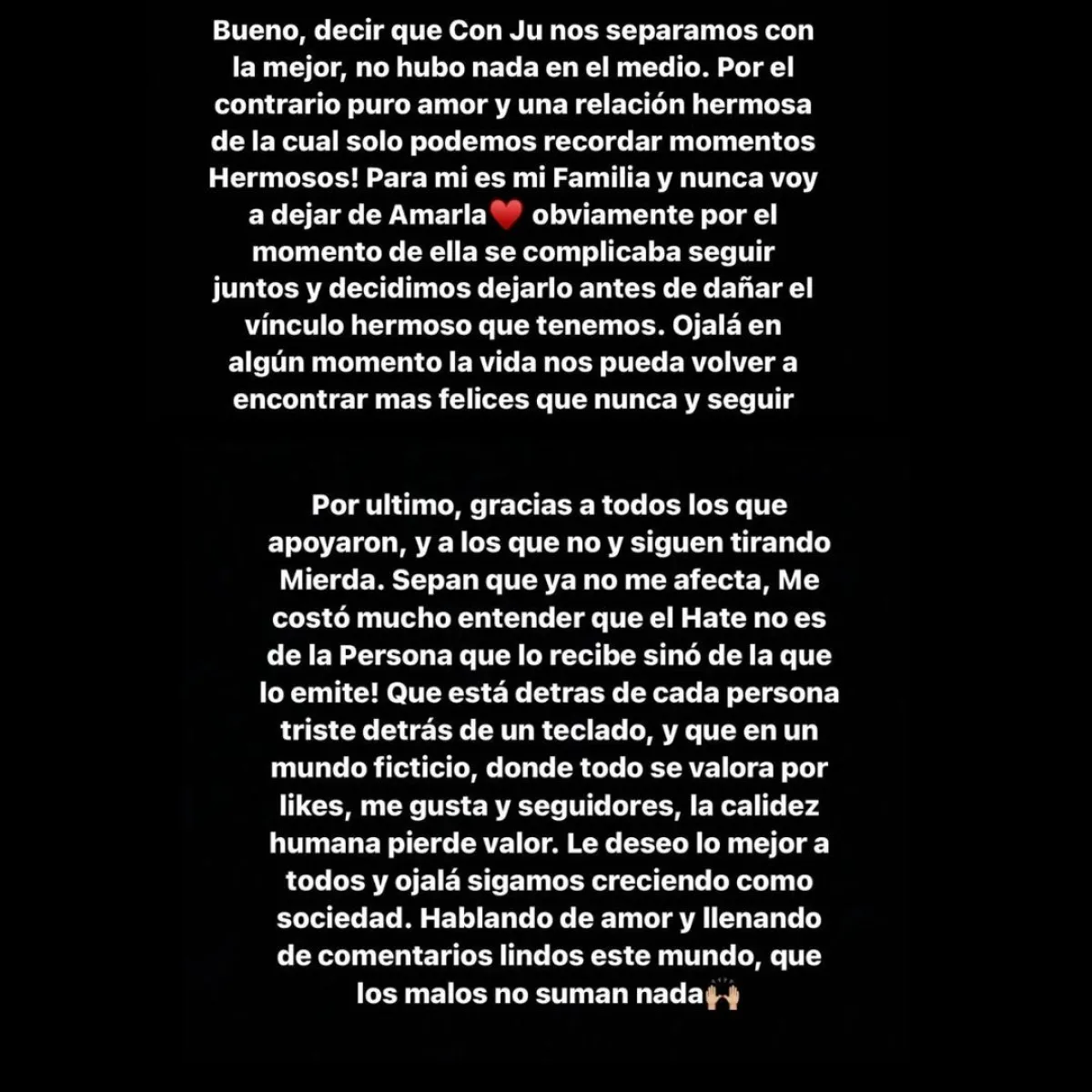 Ahora, Lucca rompió el silencio y escribió en sus historias de Instagram su versión de los hechos. "Bueno, decir que con Ju nos separamos con la mejor, no hubo nada en el medio. Por el contrario, puro amor y una relación hermosa de la cual solo podemos recordar momentos hermosos", comenzó Bardelli.