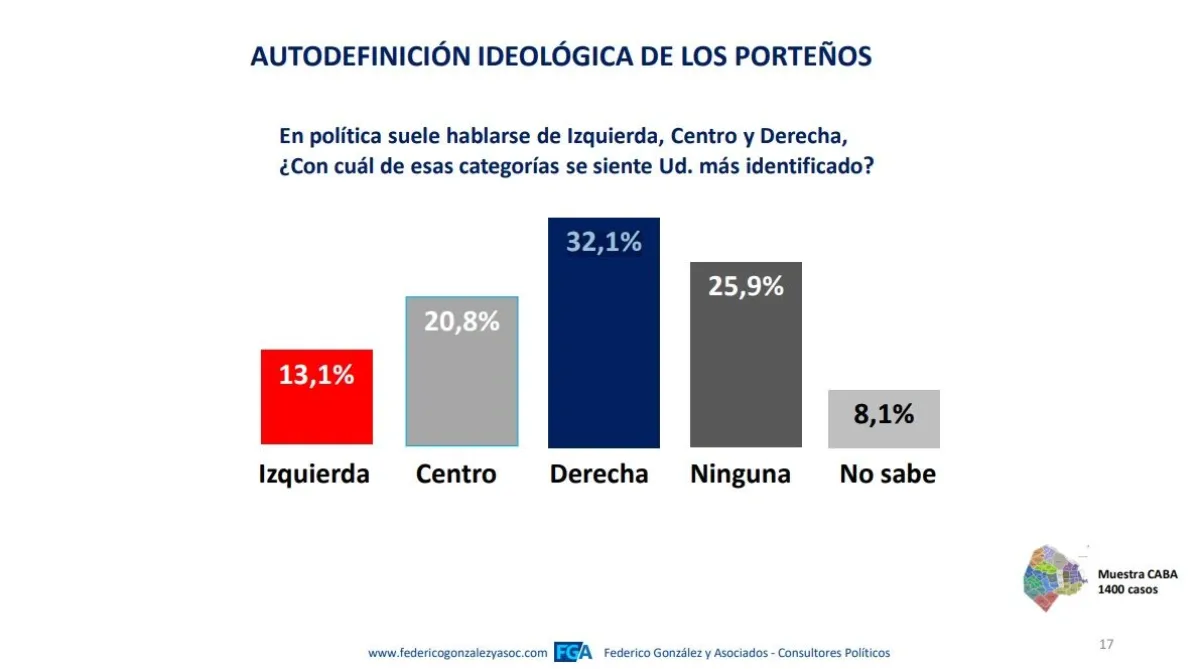 Por otro lado, cuando se indagó al respecto de la autodefinición ideológica de los porteños, para saber si se identificaban más con la Izquierda, Centro o Derecha, la respuesta más votada fue la derecha, con un 32,1%.
