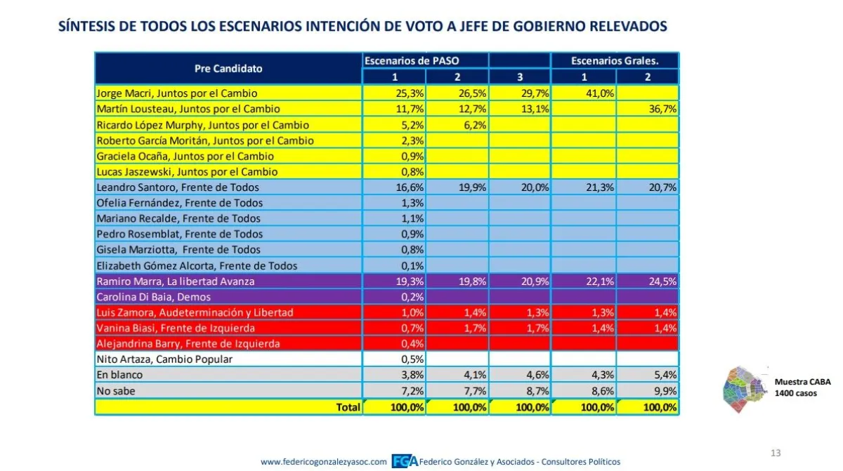 El estudio, efectuado entre 1 de junio y el 5 de junio del corriente año, fue realizado por Federico González y Asociados y revela que Jorge Macri es el candidato mejor posicionado con 25,3% dentro de Juntos por el Cambio.