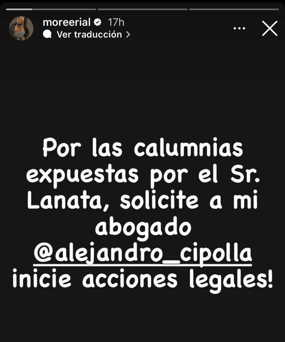 “Por las calumnias expuestas por el Señor Lanata, solicite a mi abogado Alejandro Cipolla que inicie acciones legales”, comunicó Morena en sus historias de Instagram dejando en claro su molestia hacia el periodista.