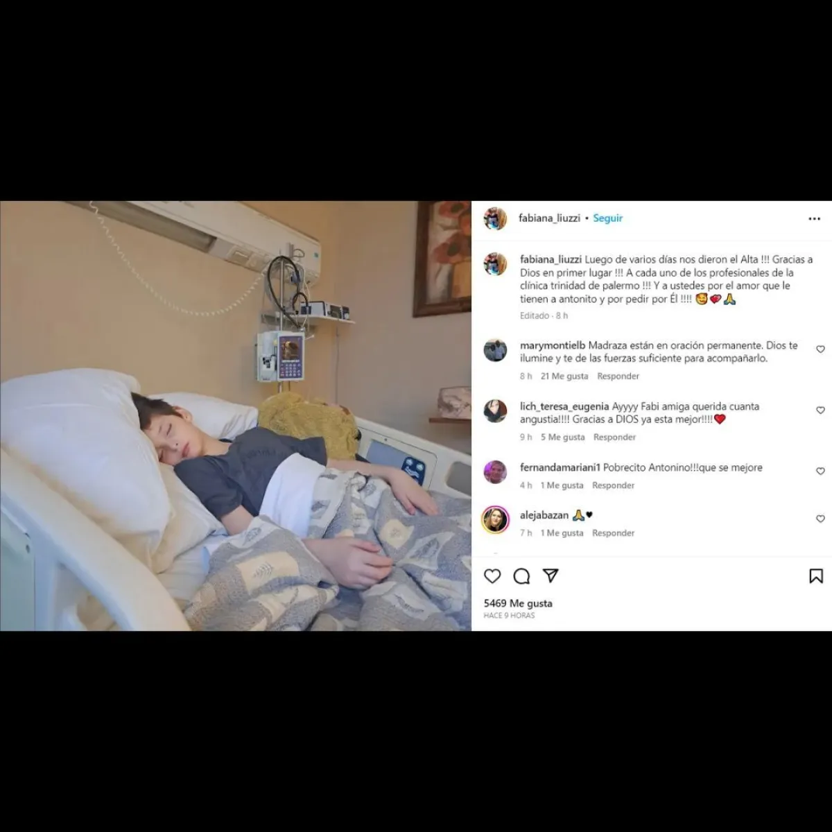 Este lunes, al confirmarse la buena noticia, la madre publicó en Instagram: “Luego de varios días nos dieron el alta!! Gracias a Dios en primer lugar! A cada uno de los profesionales de la clínica Trinidad de Palermo! Y a ustedes por el amor que le tienen a Antonito y por pedir por él”.