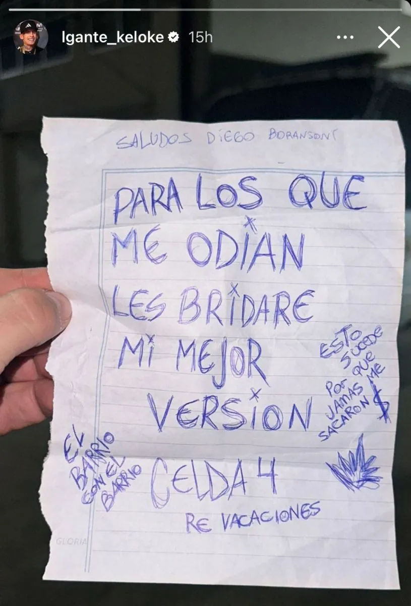 “Para los que me odian les brindaré mi mejor versión. Celda 4, re vacaciones. El barrio con el barrio”, escribió el músico, quién adoptó la costumbre de publicar manuscritos con mensajes para sus seguidores.