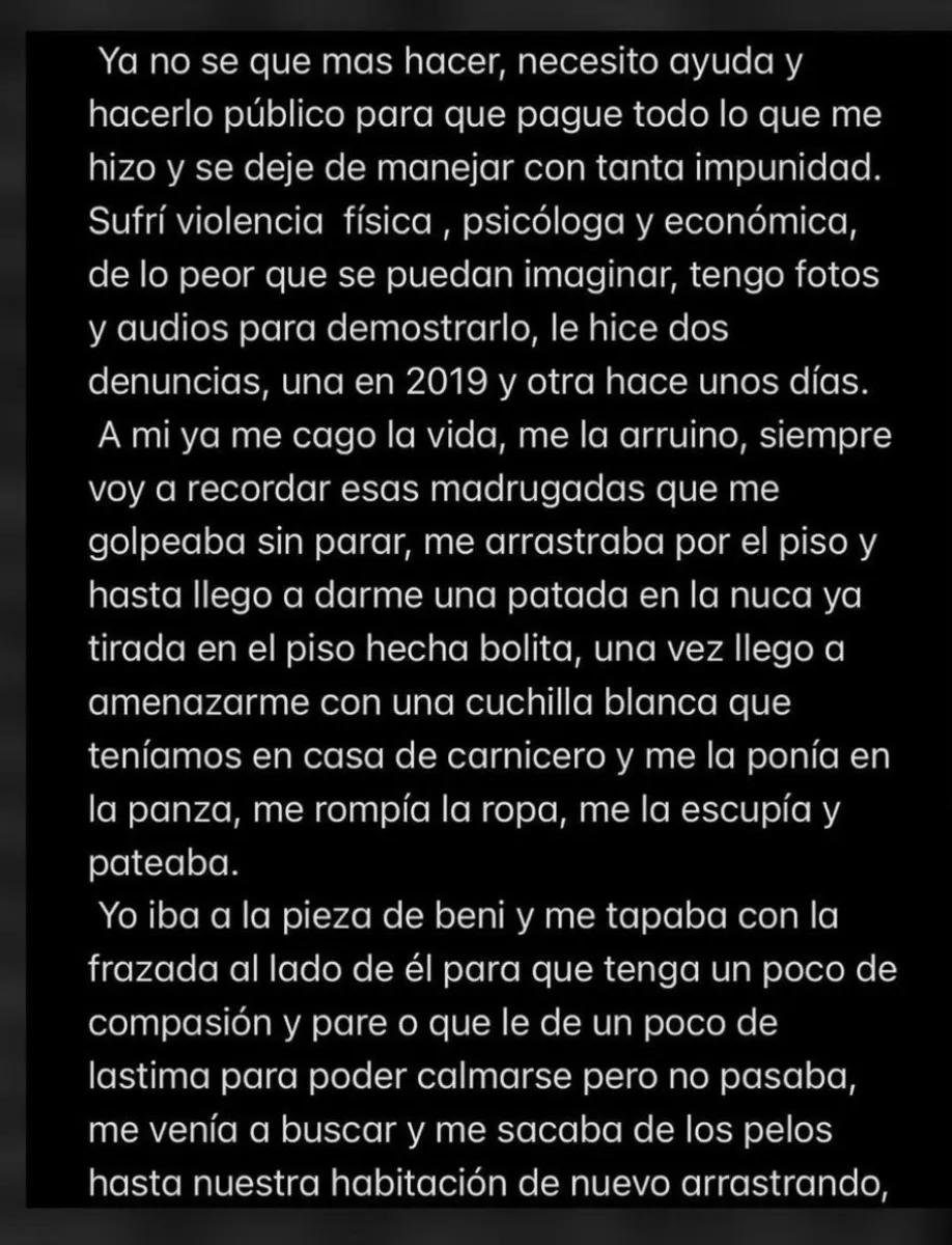 "A mi ya me cag.. la vida, me la arruinó, siempre voy a recordar esas madrugadas que me golpeaba sin parar. Me arrastraba por el piso y hasta llego a darme una patada en la nuca ya tirada en el piso hecha bolita. Una vez llego a amenazarme con una cuchilla blanca que teníamos en casa de carnicero y me la ponía en la panza, me rompía la ropa, me la escupía y pateaba", continua el relato.