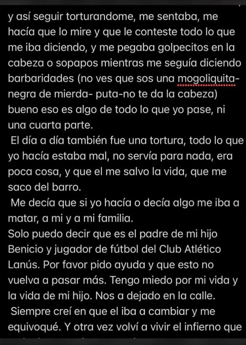 En un detallado testimonio, la joven reveló impactantes experiencias de convivencia con el jugador y expresó su temor por su propia vida y la de su hijo. La denunciante comentó que "Siempre creí en que el iba a cambiar y me equivoqué. Y otra vez volví a vivir el infierno que no le deseo a ninguna mujer y menos con un hijo".