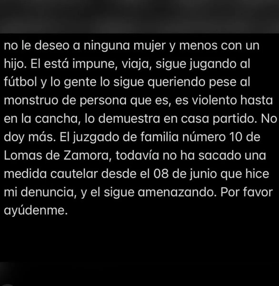 Por último apuntó contra la impunidad que tiene por su trabajo: "Él está impune, viaja, sigue jugando al fútbol y la gente lo sigue queriendo pese al monstruo de persona que es. Es violento hasta en la cancha y lo demuestra en cada partido. No doy más".