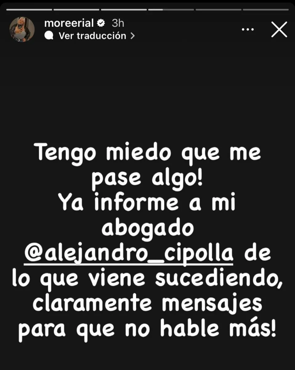 “Tengo miedo que me pase algo! Ya informe a mi abogado Alejandro Cipolla de que lo viene sucediendo, claramente mensajes para que no hable más”, sostuvo Morena en sus historias de Instagram.