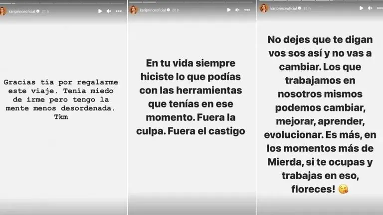“Gracias tía por regalarme este viaje. Tenía miedo de irme pero tengo la mente menos desordenada. Tkm”, escribió la cantante y continuó: “En tu vida siempre hiciste lo que podías con las herramientas que tenías en ese momento. Fuera la culpa y fuera el castigo”.