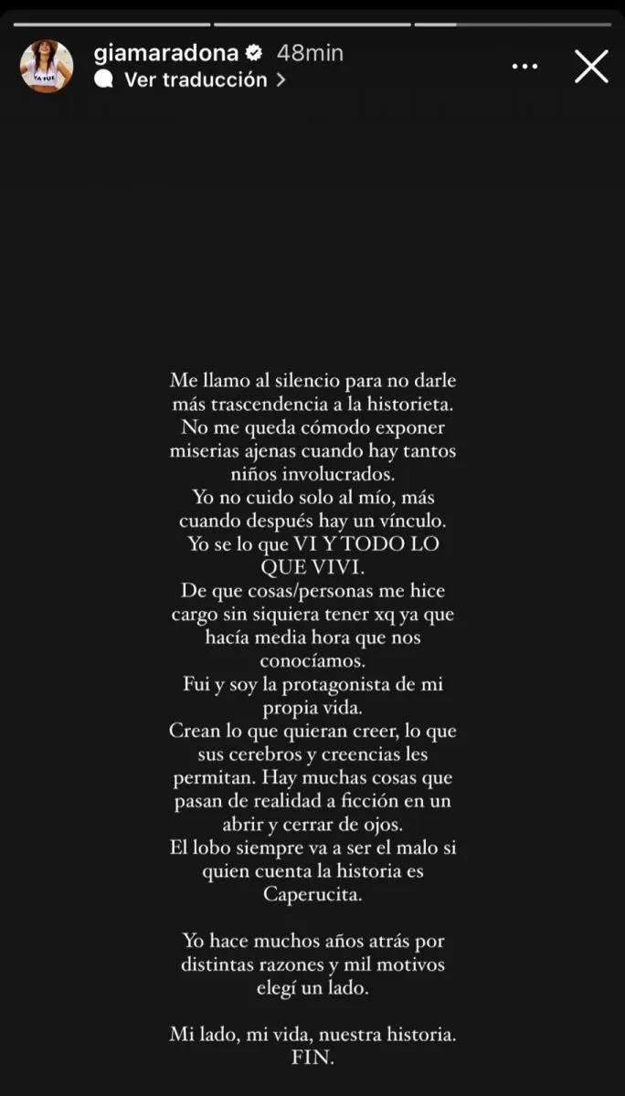 “Me llamo al silencio para no darle más trascendencia a la historieta. No me queda cómodo exponer miserias ajenas cuando hay tantos niños involucrados. Yo no cuido solo al mío, más cuando después hay un vínculo. Yo sé lo que vi y todo lo que viví. De qué cosas/personas me hice cargo sin siquiera tener por qué ya que hacía media hora que nos conocíamos”, sostuvo la hija del astro del fútbol.