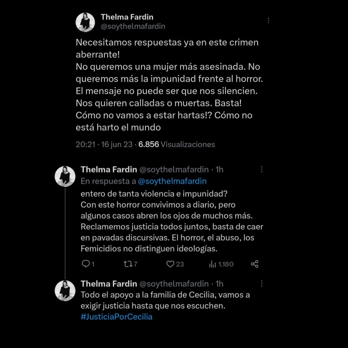 Mediante un hilo de Twitter, la actriz indicó: "¡Necesitamos respuestas ya en este crimen aberrante! No queremos una mujer más asesinada. No queremos más la impunidad frente al horror. El mensaje no puede ser que nos silencien".