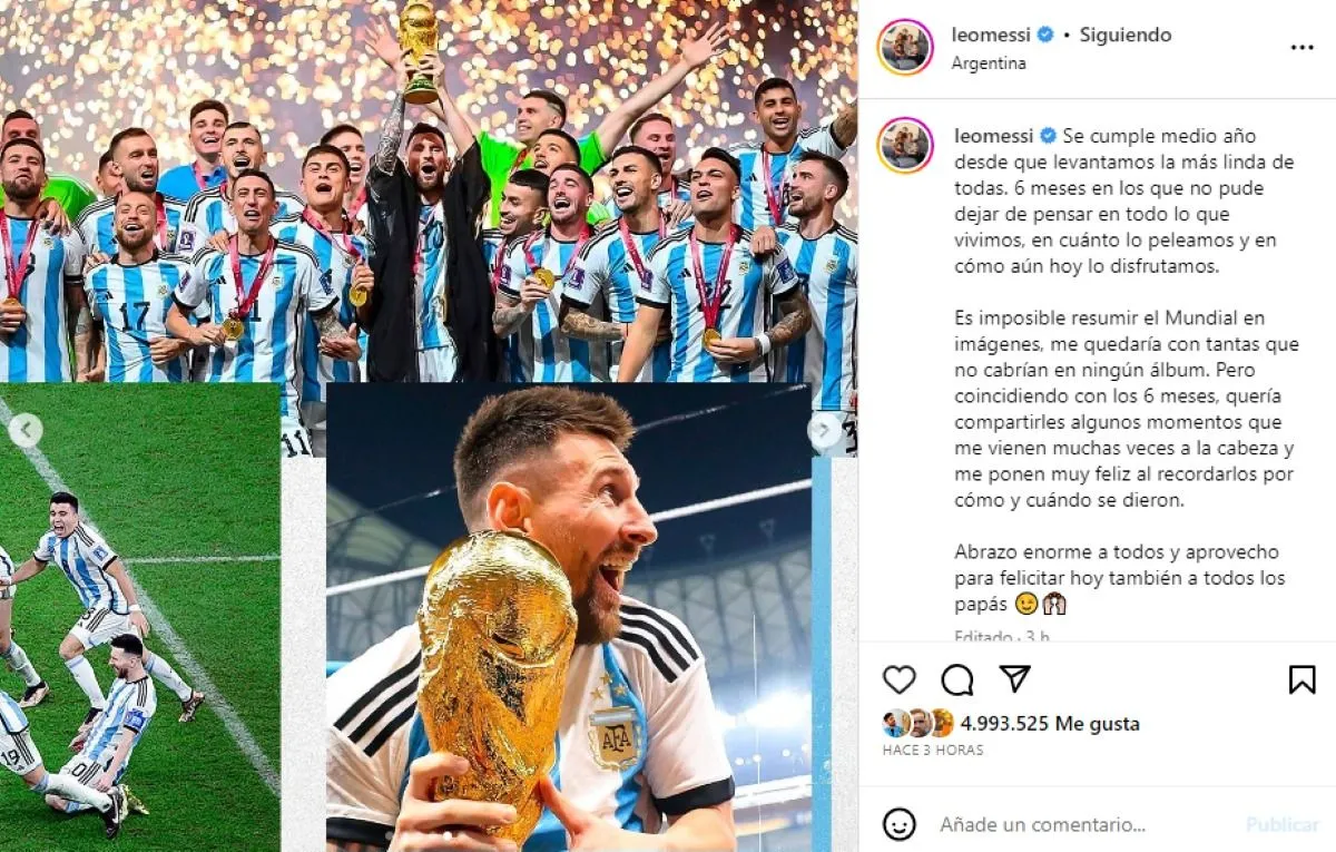 "Se cumple medio año desde que levantamos la más linda de todas. 6 meses en los que no pude dejar de pensar en todo lo que vivimos, en cuánto lo peleamos y en cómo aún hoy lo disfrutamo", comienza el escrito de Messi en su posteo por el aniversario del Mundial.