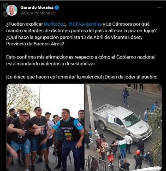 Morales había posteado en su cuenta de la red social: "¿Pueden explicar @alferdez, @CFKargentina y La Cámpora por qué manda militantes de distintos puntos del país a alterar la paz en Jujuy?".