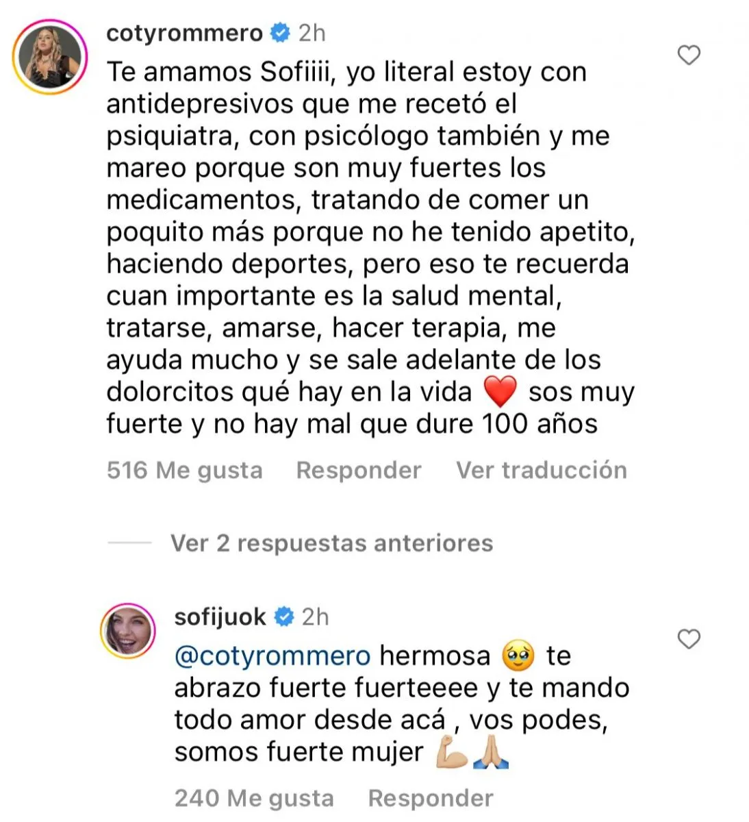 “Te amamos Sofi, yo literal estoy con antidepresivos que me recetó el psiquiatra, con psicólogo también y me mareo porque son muy fuertes los medicamentos”, comentó la ex Gran Hermano en un posteo de Jujuy sobre la superación y el amor propio.