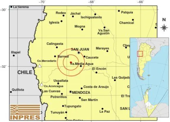 Según el reporte del Instituto Nacional de Prevención Sísmica (INPRES), se registró un sismo de magnitud 4.8 en la Escala de Richter. El epicentro del temblor se localizó a una profundidad de tan solo siete kilómetros, aproximadamente a 53 kilómetros al sudoeste de la capital de San Juan.