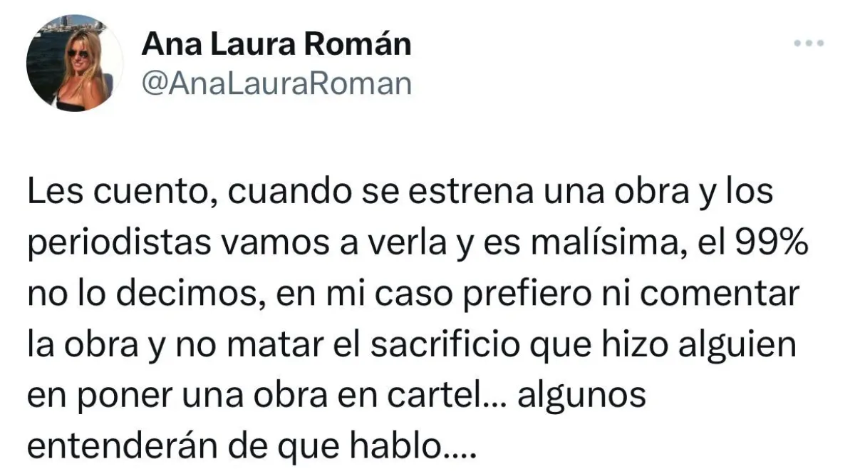 "Les cuento, cuando se estrena una obra y los periodistas vamos a verla y es malísima, el 99% no lo decimos…”, empezó escribiendo en Twitter Ana. “No pagaría una entrada para verla”, había dicho la periodista haciendo referencia a la participación de Julieta Poggio en la obra