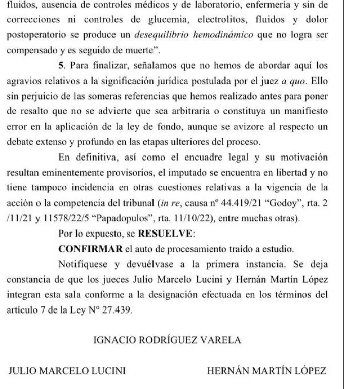 Para el juez, el asunto ya está bajo evaluación en el proceso por las lesiones graves, el cual espera una confirmación en la instancia de Casación. En dicho expediente, Lotocki fue inhabilitado para ejercer como médico. En su resolución, Schelgel se basa en el principio jurídico de litispendencia, que hace referencia a un juicio pendiente.