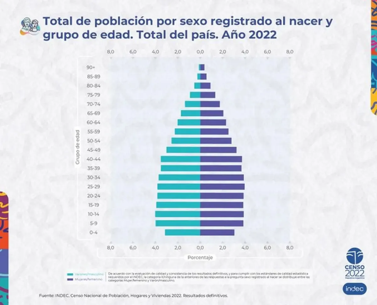 El informe confirma que hay 23.705.494 mujeres y 22.186.791 varones. A su vez, a partir de los resultados se puede observar cómo evolucionó la estructura de la población en el territorio argentino desde 1869 en función del sexo y la edad.