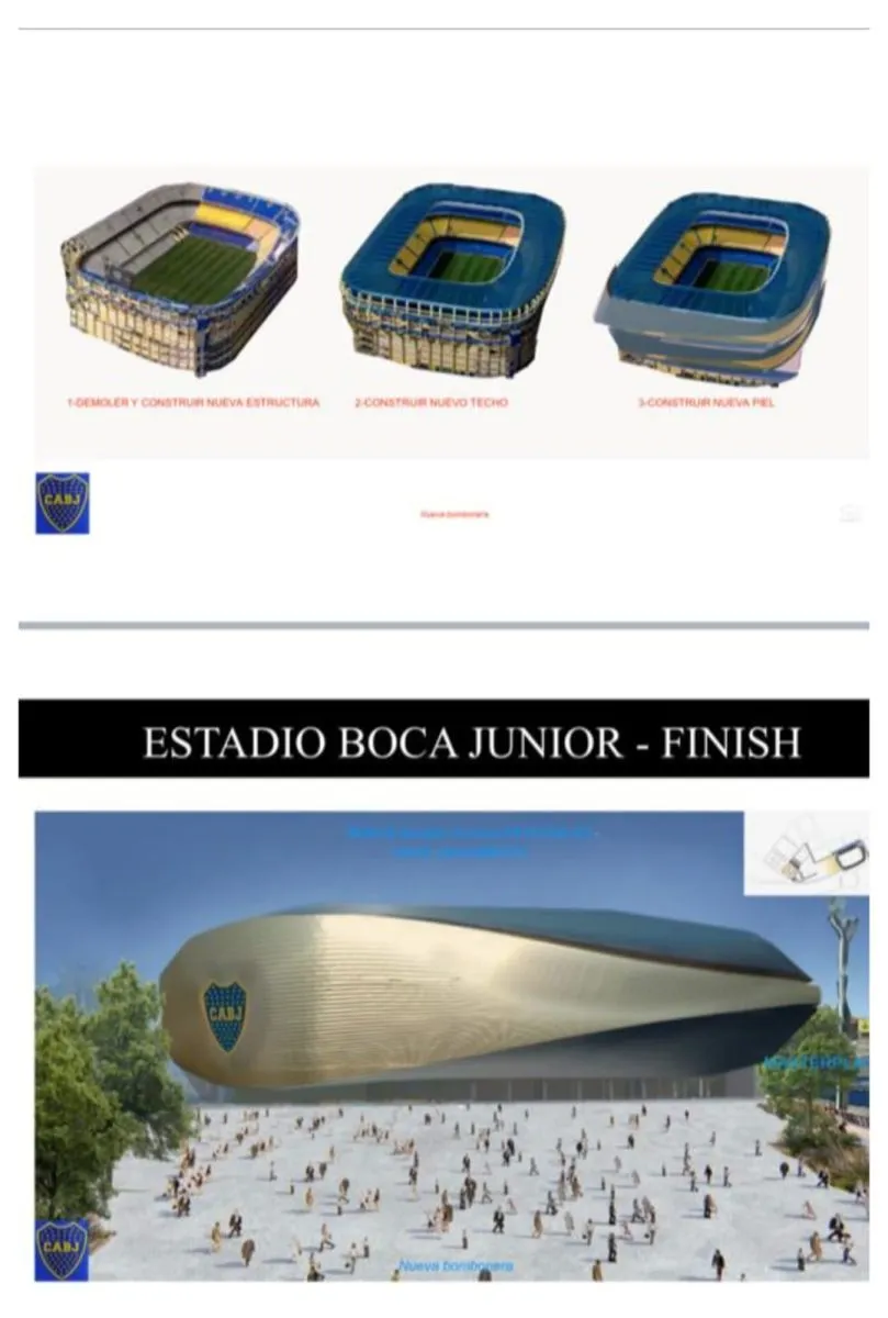 En cuanto a la imágen en la que se ven dos estadios, el arquitecto aclaró: "Eso es la bombonerita, que quedaría como de entrenamiento junto a una de las canchas de pasto donde entrena el fútbol femenino ahora". Y sumó: "El primer anillo o tribuna desaparecería, los palcos VIP también y se reemplazan con bandejas nuevas y la cancha terminaría teniendo tres bandejas techadas para noventa mil espectádores".