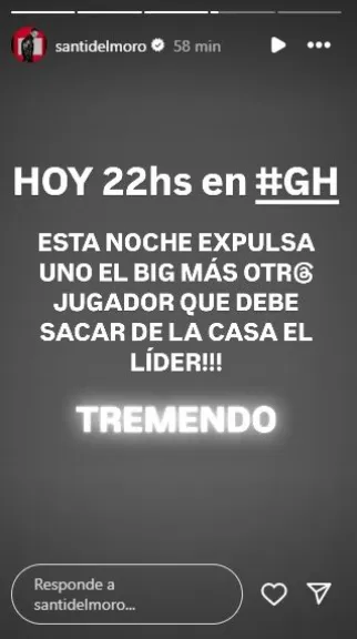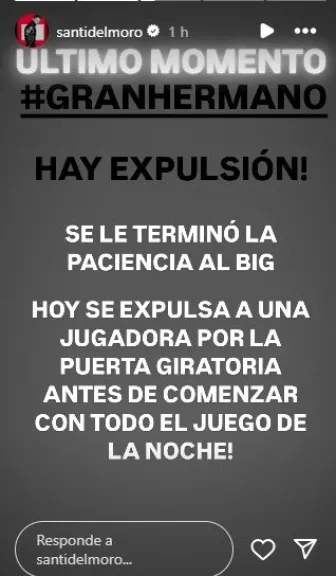 En varias historias publicadas en su cuenta de Instagram, del Moro comentó que a “Big” se “le terminó la paciencia” y que debido a ello eliminará a una jugadora del reality, que actualmente no ha sido revelada.