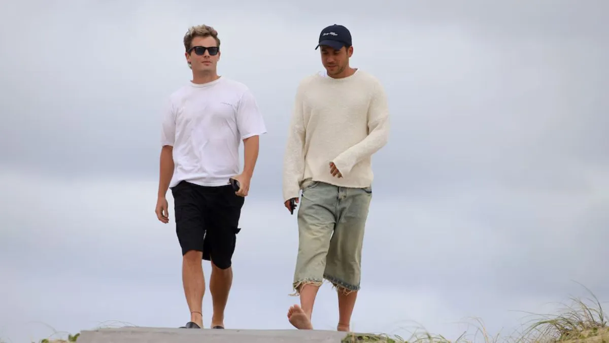 Dente vistió una bermuda de jean oversize, un sweater de lana manga larga y una remera blanca debajo el mismo, además de una gorra azul. En el caso de Turturiello, el joven también vistió una remera blanca, acompañado de una bermuda azul y unas ojotas a juego.