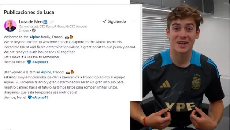 A través de su cuenta de LinkedIn, de Meo publicó un mensaje cargado de entusiasmo: “¡Bienvenido a la familia Alpine, Franco! Estamos muy emocionados de dar la bienvenida a Franco Colapinto al equipo Alpine. Su increíble talento y gran determinación serán un gran impulso para nuestro camino hacia el futuro. Estamos listos para romper límites juntos. ¡Hagamos que esta temporada sea inolvidable! ¡Vamos, Nene!”.