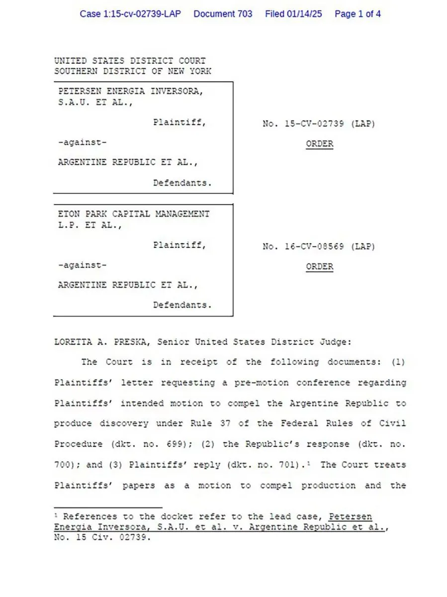 Loretta Preska emitió un fallo clave, obligando al país a revelar datos clave solicitados por los demandantes.