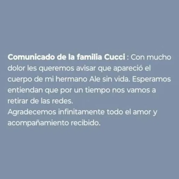 “Con mucho dolor les queremos avisar que apareció el cuerpo de mi hermano Ale sin vida. Esperamos entiendan que por un tiempo nos vamos a retirar de las redes. Agradecemos infinitamente todo el amor y acompañamiento recibido”, escribió Juliana, su hermana, en Facebook.