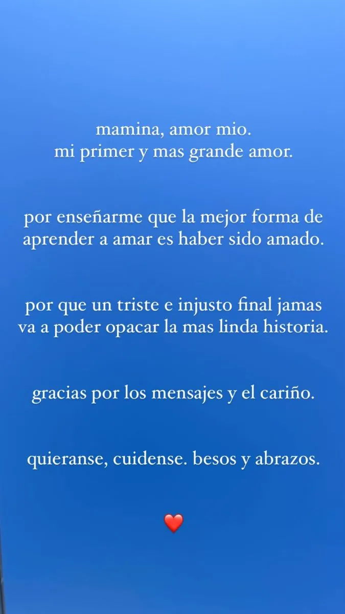 “Mamina, amor mío, mi primer y más grande amor. Por enseñarme que la mejor forma de aprender a amar es haber sido amado. Porque un triste e injusto final jamás va a poder opacar la más linda historia”, expresó el joven de 30 años, en sus redes sociales, con letras blancas sobre un fondo celeste cielo.