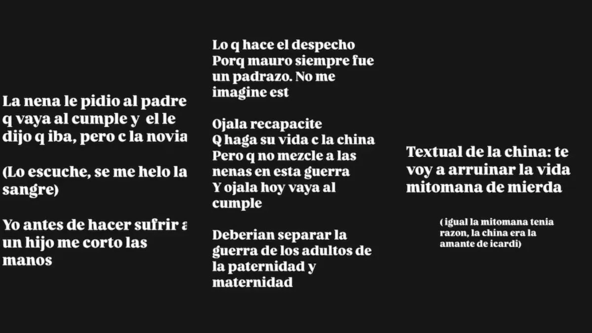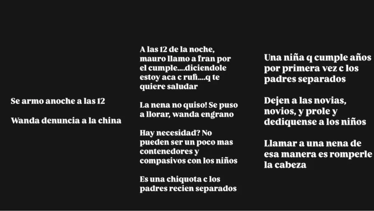 “A las 12 de la noche Mauro llamó a Fran por el cumple diciéndole ‘estoy acá con Rufi que te quiere saludar’ (la hija mayor de la China). ¡La nena no quiso! Se puso a llorar, Wanda engranó”, comenzó contando en sus historias de Instagram la conductora Yanina Latorre. “Ahí se matan Wanda y Mauro, se dijeron de todo, Wanda enloquecida por el llamado del padre con los hijos de la nueva novia. Todo un escándalo”, agregó, en otras historias.