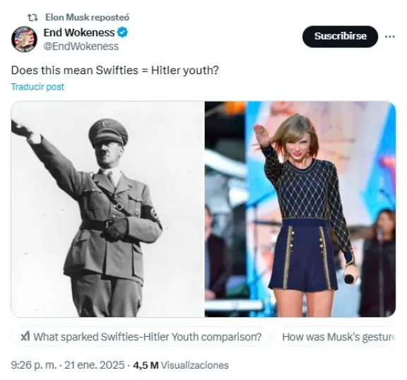 El gesto rápidamente se viralizó en X, la plataforma de redes sociales que Musk posee, donde varios usuarios lo compararon con un saludo nazi. Uno de los comentarios más llamativos fue el que comparó un gesto de Taylor Swift: "¿Esto significa que las swifties son la juventud hitleriana?", en referencia a los seguidores de la cantante, a quien Musk cruzó varias veces.