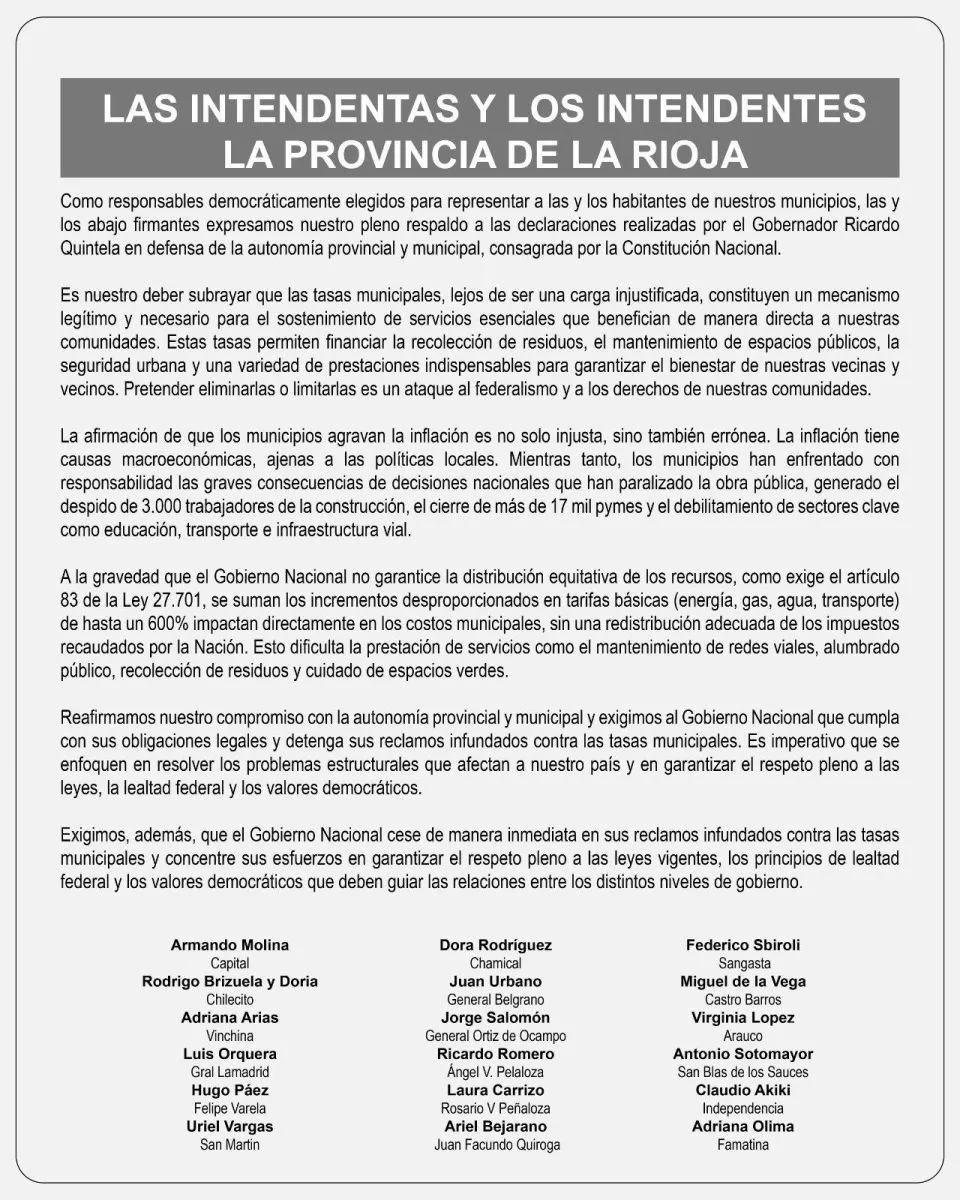 En esa línea, agregaron: "Exigimos que el Gobierno Nacional cese de manera inmediata en sus reclamos infundados contra las tasas municipales y concentre sus esfuerzos en garantizar el respeto pleno a las leyes vigentes, los principios de lealtad federal y los valores democráticos que deben guiar las relaciones entre los distintos niveles".