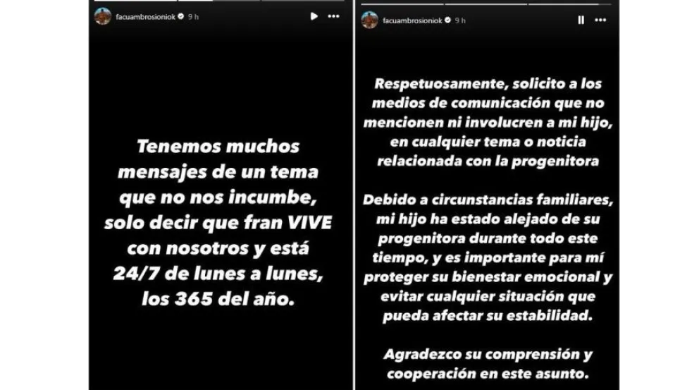 "Tenemos muchos mensajes de un tema que no nos incume, solo decir que Fran vive con nosotros y está 24/7 de lunes a lunes, los 365 (días) del año", comenzó en un comunicado a través de su cuenta de Instagram. De esta manera, explicó: "Respetuosamente, solicito a los medios de comunicación que no mencionen ni involucren a mi hijo, en cualquier tema o noticia relacionada con la progenitora".