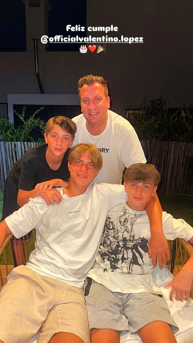 En su cuenta oficial de Instagram, López primero mostró cómo inició el pre cumpleaños de Valentino: un almuerzo de ellos dos junto a Constantino y Benedicto, los otros hijos del ex futbolista; y Bastian Demichelis, el hijo de Evangelina Anderson y Martín Demichelis. Su madre tampoco dejó pasar la ocasión y le dedicó unas amorosas historias en su cuenta: “Te amo mi amor. Mi primer gran amor cumple 16”.