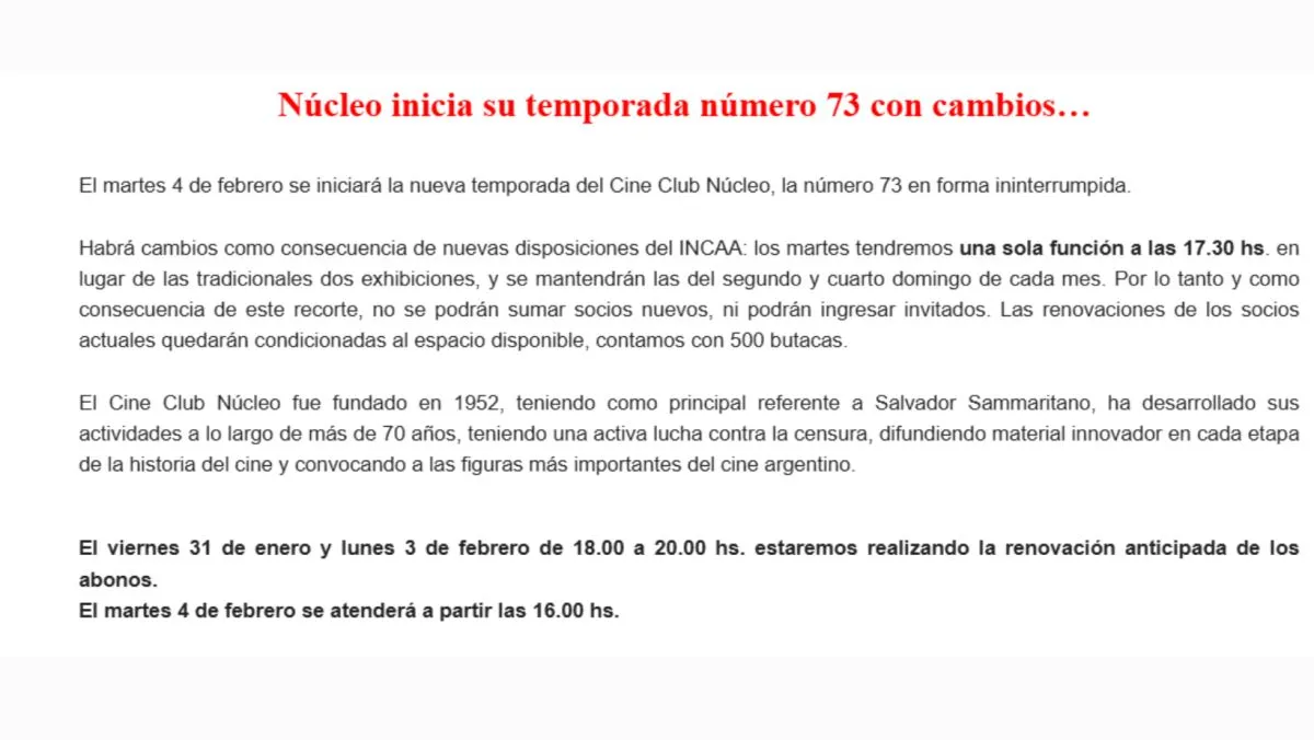 “El Cine Club Núcleo fue fundado en 1952, teniendo como principal referente a Salvador Sammaritano, ha desarrollado sus actividades a lo largo de más de 70 años, teniendo una activa lucha contra la censura, difundiendo material innovador en cada etapa de la historia del cine y convocando a las figuras más importantes del cine argentino.”, continuó explicando el comunicado. Además, las autoridades anunciaron que entre el 31 de enero y 3 de febrero, de 18 a 20 hs, llevarán a cabo la renovación anticipada de los abonos.