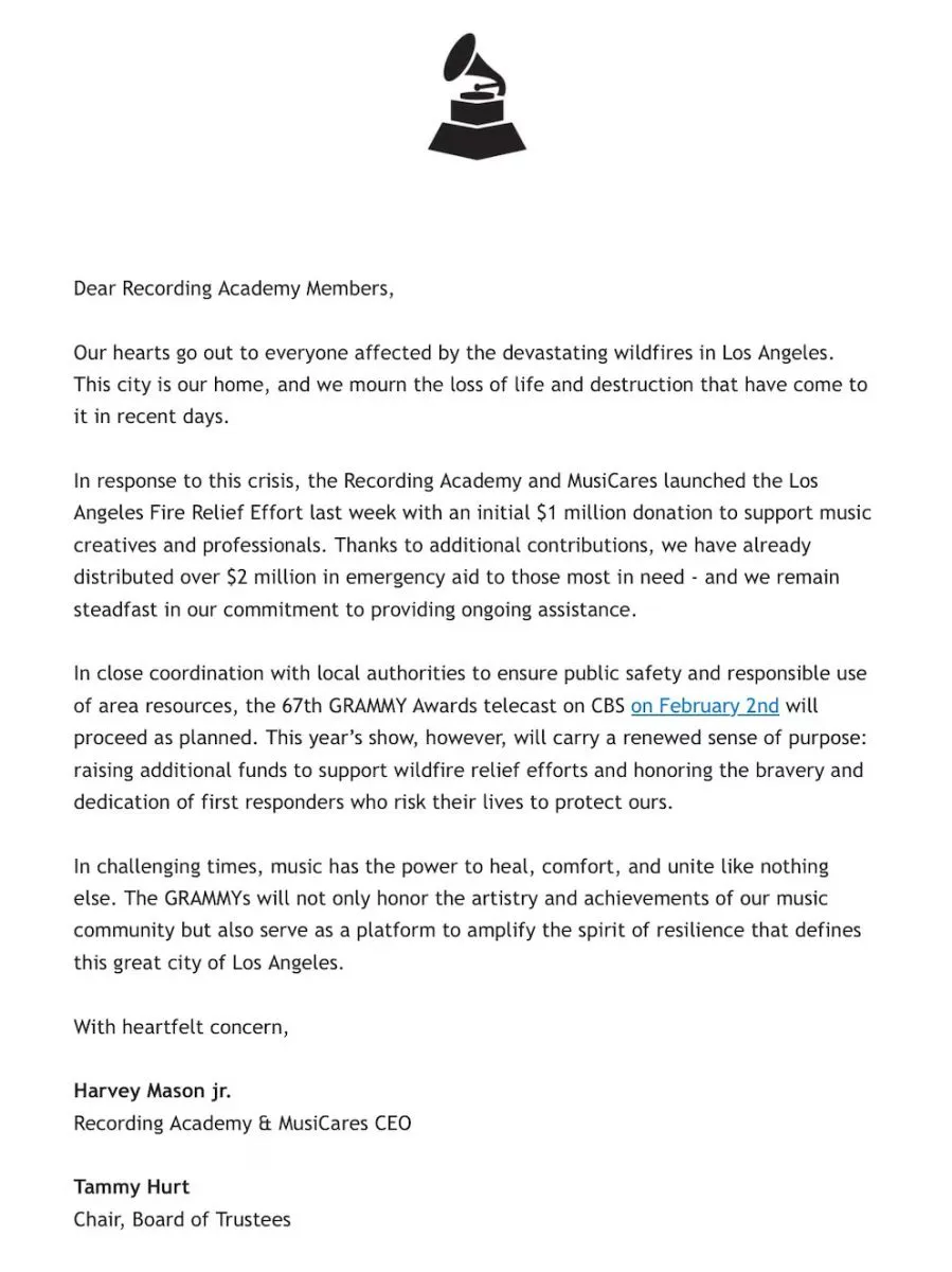 La 67ª edición de los Premios Grammy se celebrará el 2 de febrero en Los Ángeles y tendrá como objetivo recaudar fondos para las víctimas de los incendios en California.