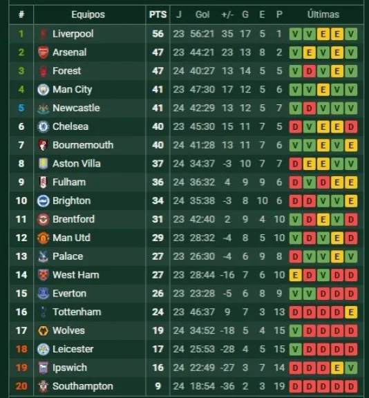 Con estos resultados, el Liverpool reafirma nuevamente su posición como líder, ahora con 56 puntos. Sus más cercanos perseguidores son el Arsenal y el Nottingham, que están empatados en puntos (47), aunque los "Gunners" tienen un partido por jugar. Se pone buena la Premier League.