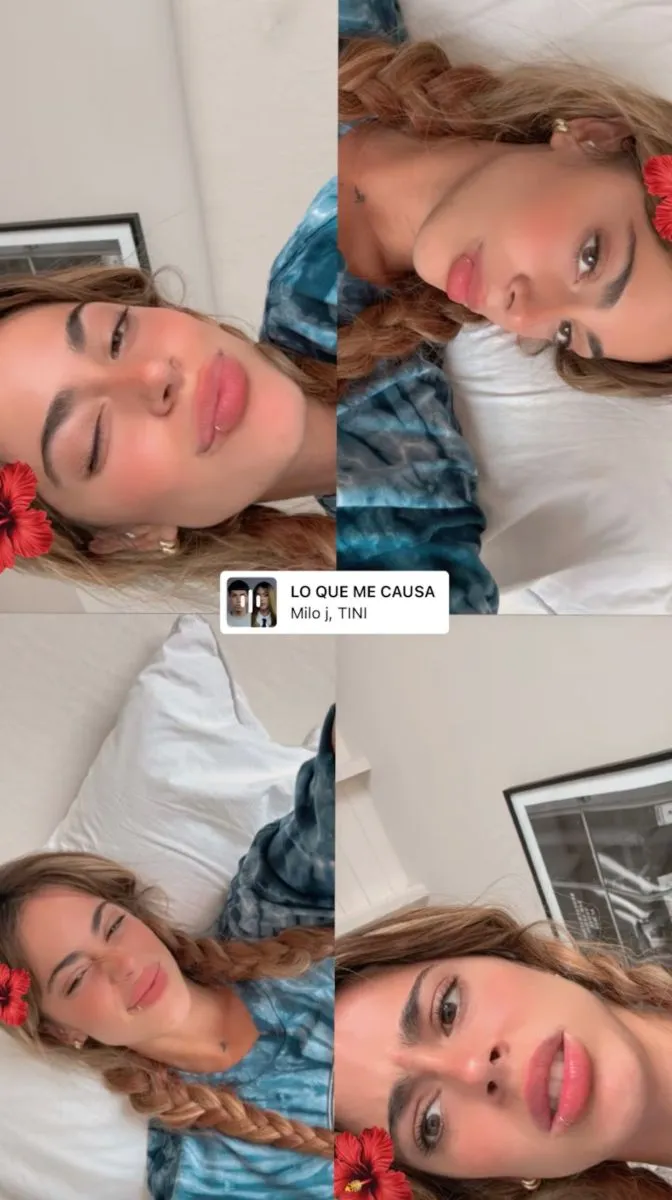 Recostada sobre una cama con sábanas blancas y vistiendo una remera batik en tonos azules, Tini optó por un maquillaje sutil con máscara de pestañas, rubor y un brillo ligero en los labios. Acompañó las imágenes con su nueva canción "Lo que me causa", en colaboración con Milo J, destacando un fragmento de la letra: "Ya no somos los de antes, ¿en qué momento te cansaste?".