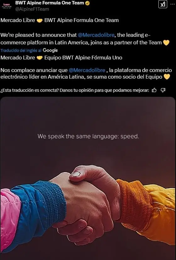 Mercado Libre celebró la alianza con una publicación en su cuenta oficial de Instagram: “Hablamos el mismo idioma: el de la velocidad. Somos team partner de @alpinef1team. Lo mejor está llegando”. Con este acuerdo, la empresa argentina refuerza su presencia en el automovilismo de elite, luego de haber patrocinado previamente a Williams durante la estadía del piloto argentino Franco Colapinto en la escudería británica.