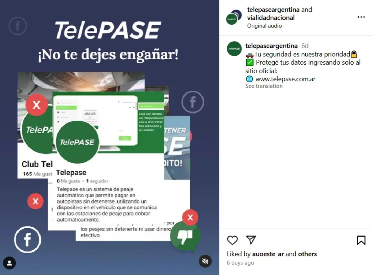 La empresa TelePASE alertó a los usuarios con un mensaje a través de sus redes sociales que no pasó inadvertido. "Hay cuentas falsas haciéndose pasar por nosotros. No te dejes engañar", arranca el spot donde ponen en conocimiento a la gente sobre la existencia de cuentas truchas que estafan a los usuarios que quieren obtener la oblea para usar el telepeaje. El objetivo del comunicado es prevenir estafas, por lo que la empresa recomendó seguir e informarse, solamente, por los canales oficiales de la firma: TelePASE en Facebook y telepaseargentina en Instagram son las redes válidas. “Tu seguridad es nuestra prioridad. Protegé tus datos ingresando solo al sitio oficial: www.telepase.com.ar”, dice el texto informativo vía Instagram. “¡Si ves otra cuenta denúnciala! Entre todos combatimos las estafas digitales”, completa. Desde hace un tiempo existen páginas web truchas, en donde los usuarios que quieren sacar su TelePASE ponen su información y hasta sus datos de la tarjeta de crédito, cayendo en graves estafas.