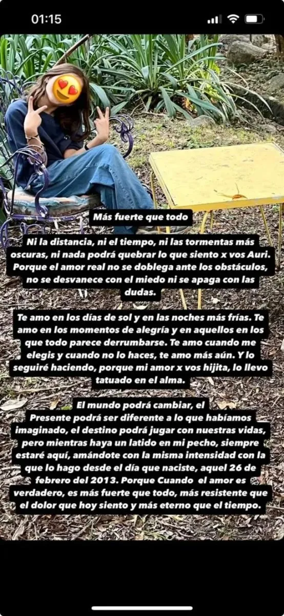 "Ni la distancia, ni el tiempo, ni las tormentas más oscuras, ni nada podrá quebrar lo que siento x vos, Auri. Porque el amor real no se doblega ante los obstáculos, no se desvanece con el miedo ni se apaga con las dudas. Te amo en los días de sol y en las noches más frías. Te amo en los momentos de alegría y en aquellos en los que todo parece derrumbarse", escribió el cantante junto a una foto de la nena, tapándole el rostro con un emoji.
