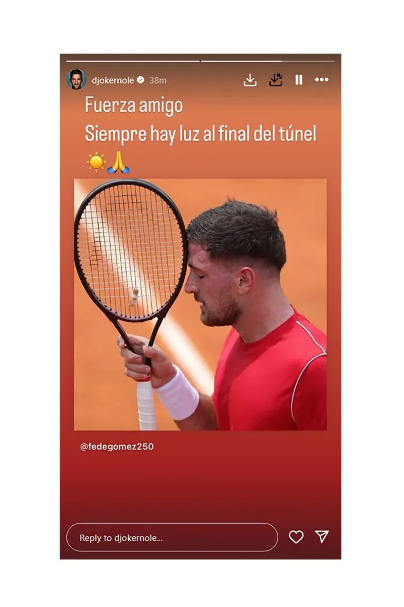 El tenista serbio compartió el posteo de Gómez y le dedicó unas palabras en español: “Fuerza amigo. Siempre hay luz al final del túnel”. Además, acompañó el mensaje con dos emojis: un sol y unas manos en señal de rezo.