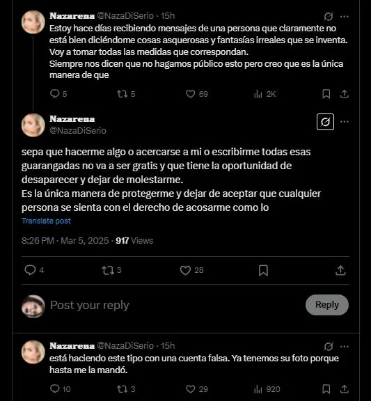 En las últimas horas, Naza Di Serio reveló que está viviendo una dramática situación y está muy preocupada. La periodista contó que está siendo acosada por un hombre en las redes sociales, y advirtió que tomará cartas en el asunto. A través de sus redes, la periodista dio detalles de lo que está viviendo en su día a día. "Estoy hace días recibiendo mensajes de una persona que claramente no está bien diciéndome cosas asquerosas y fantasías irreales que se inventa", comenzó diciendo. Y advirtió: "Voy a tomar todas las medidas que correspondan". Y, agregó: "Siempre nos dicen que no hagamos público esto pero creo que es la única manera de que sepa que hacerme algo o acercarse a mí, o escribirme todas esas guarangadas no va a ser gratis y que tiene la oportunidad de desaparecer y dejar de molestarme". "Es la única manera de protegerme y dejar de aceptar que cualquier persona se sienta con el derecho de acosarme como lo está haciendo este tipo con una cuenta falsa", expresó.