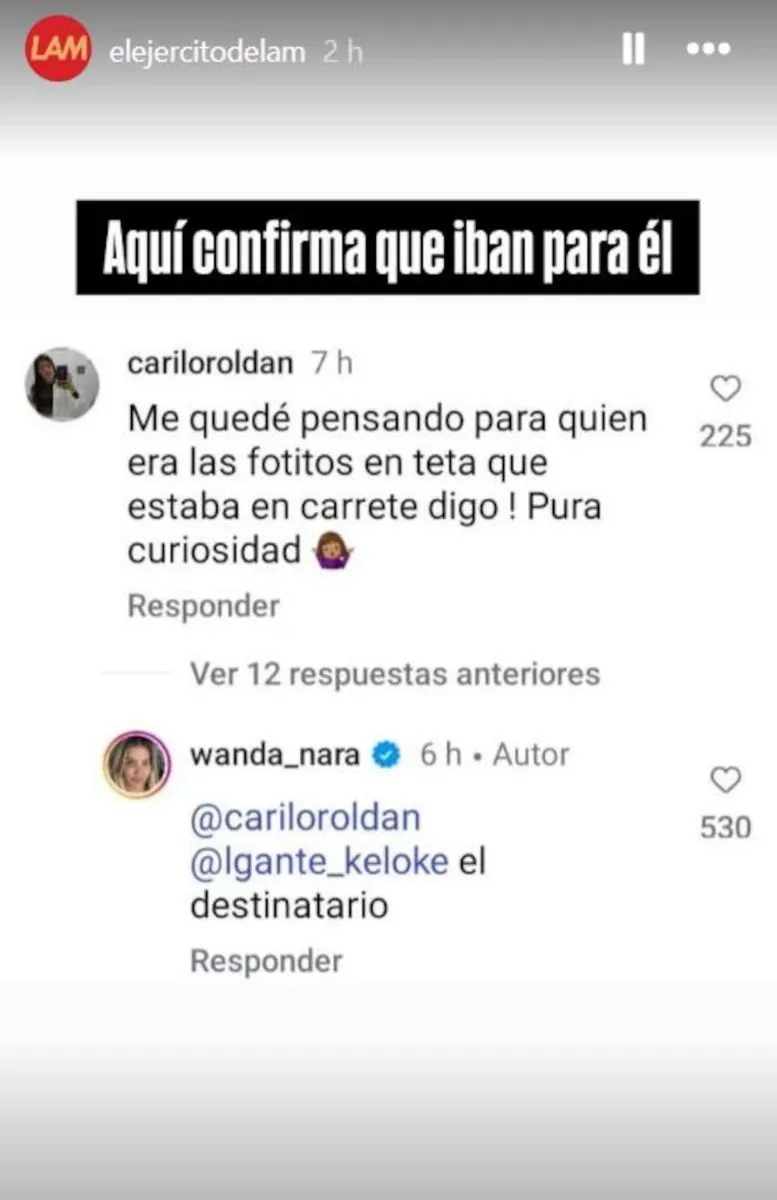 En uno de sus últimos posteos, mientras mostraba apoyo a la nueva colaboración de L-Gante con La K’onga, una seguidora le preguntó: “Me quedé pensando para quién eran las fotitos que estaban en el carrete. Pura curiosidad”, a lo que Wanda no tardó en responder: “@lgante_keloke el destinatario”.