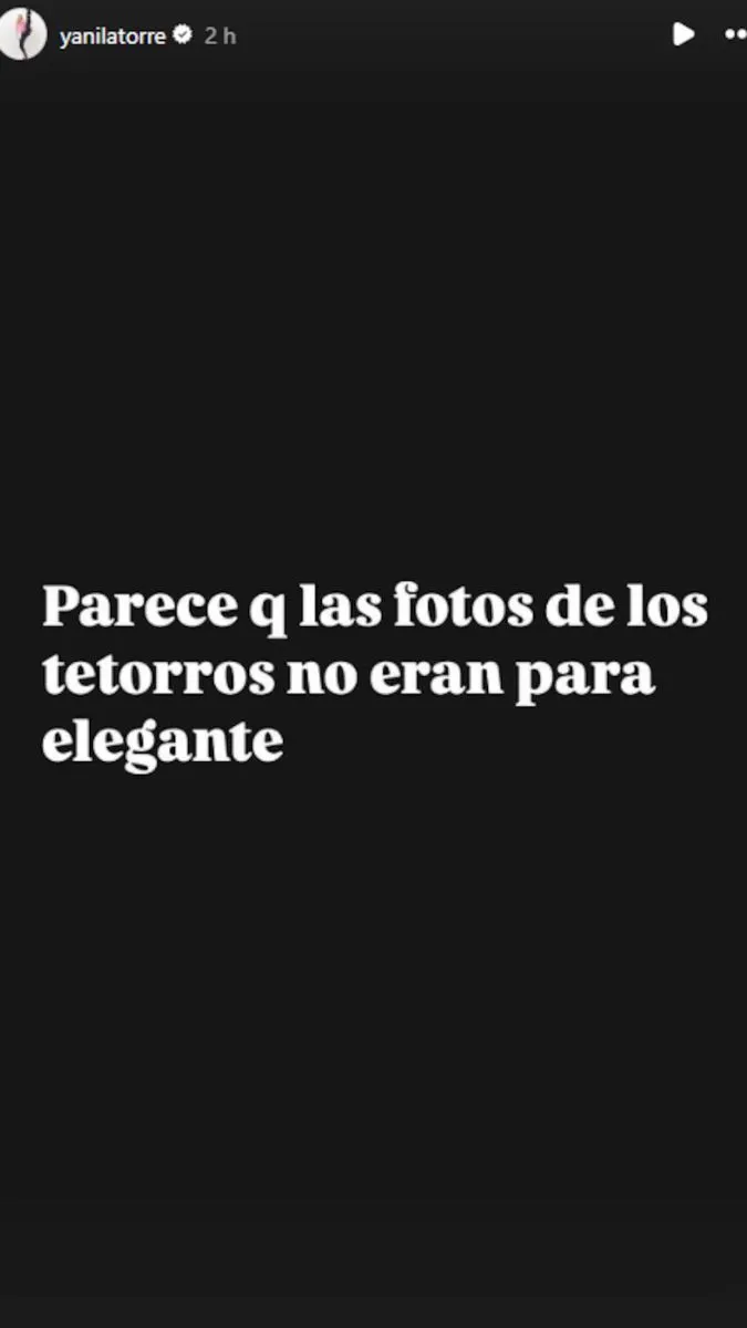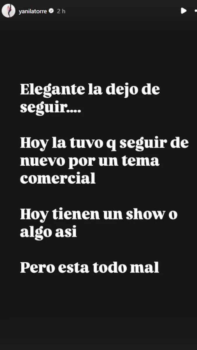 “Tengo data de Wanda. Parece que las fotos de los ‘tetorros’ no eran para ‘Elegante’. ‘Elegante’ la dejó de seguir... Hoy la tuvo que seguir de nuevo por un tema comercial. Hoy tienen un show o algo así, pero está todo mal”, reveló Latorre a través de sus redes.