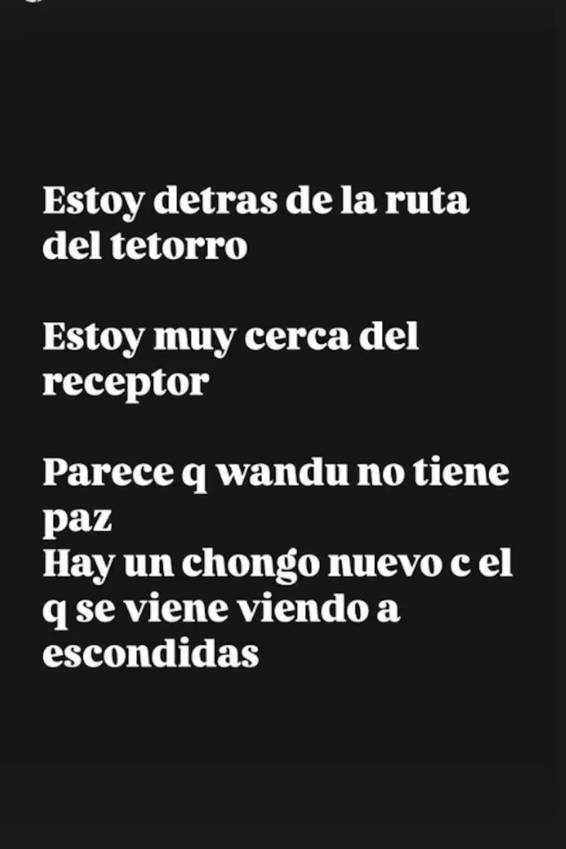 La periodista también aseguró que la mediática estaría viendo en secreto a otra persona: “Estoy detrás de la ruta del ‘tetorro’. Estoy muy cerca del receptor. Parece que Wandu no tiene paz. Hay un chongo nuevo con el que se viene viendo a escondidas. Los ‘tetorros’ eran para él”, afirmó.
