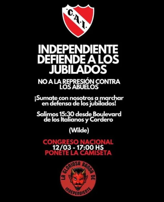 A raíz de los incidentes registrados esta semana en la marcha de los jubilados frente al Congreso de la Nación con la presencia de hinchas de Chacarita, otras hinchadas se sumaron a la próxima convocatoria. Se trata de simpatizantes de Ferro, Deportivo Merlo, Deportivo Morón y Tigre, quienes a través de las redes sociales y grupos de WhatsApp compartieron afiches invitando a los hinchas a acercarse a la marcha del miércoles próximo a las 17. En las últimas horas, se fueron sumando más hinchadas a la causa. Ya son cerca de una veintena de clubes, entre ellos Boca, River, Racing, San Lorenzo, Independiente, que marcharán el próximo miércoles a las 17 al Congreso de la Nación junto a los jubilados para exigir que el gobierno libertario oiga el reclamo. El miércoles, miles de jubilados se reunieron frente al Congreso de la Nación para pedir un aumento en sus haberes y la restitución de cobertura de medicamentos, entre otras cuestiones. Si bien la manifestación de esta semana había comenzado sin complicaciones y sobre la vereda, durante la marcha se registraron fuertes incidentes entre los manifestantes, la Policía Federal y la Gendarmería luego de que los efectivos montaron un importante operativo sobre la avenida Entre Ríos para evitar que la protesta interrumpiera el tránsito en hora pico.