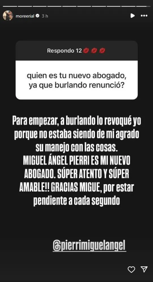 La hija de Jorge Rial también confirmó quién es su nuevo defensor: "Miguel Ángel Pierri es mi nuevo abogado. Súper atento y súper amable. Gracias, Migue, por estar pendiente a cada segundo", insinuando su disconformidad ante la gestión de Burlando.