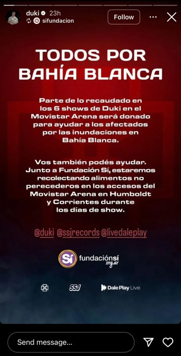 El cantante anunció en sus redes que: "Parte de lo recaudado en los 6 shows de Duki en el Movistar Arena será donado para ayudar a los afectados por las inundaciones en Bahía Blanca".