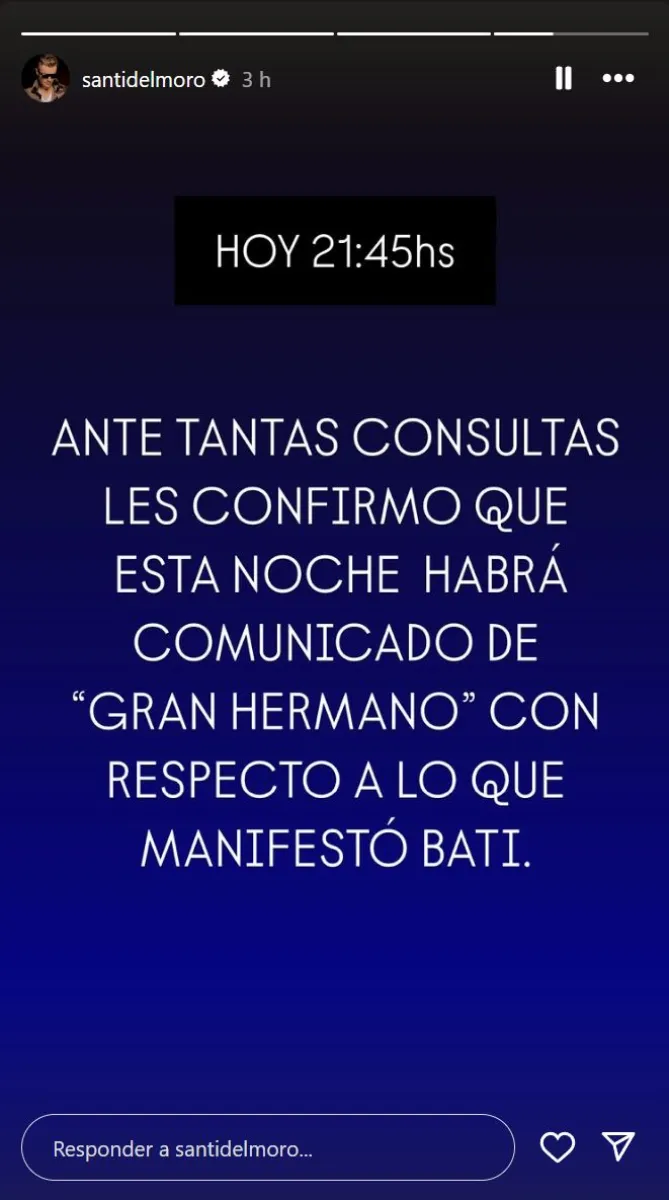 Ante la presión del público y la magnitud del debate, Santiago del Moro decidió intervenir a través de sus historias de Instagram, escribió: "Ante tantas consultas les confirmo que esta noche habrá comunicado de 'Gran Hermano' con respecto a lo que manifestó Bati".