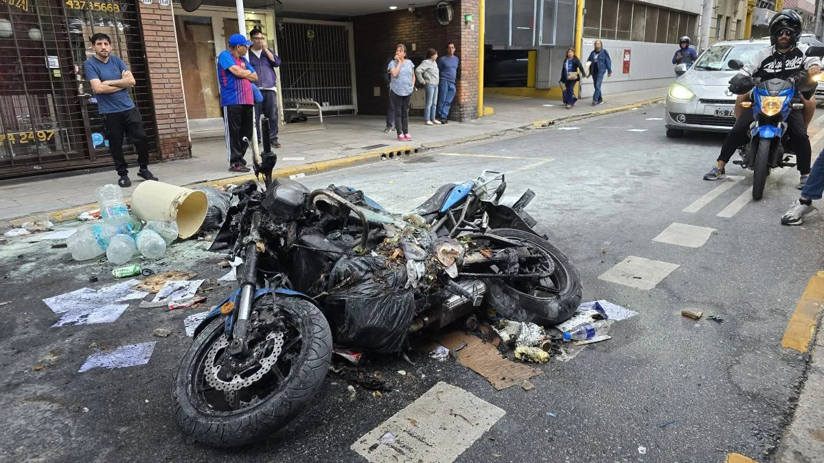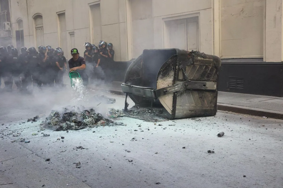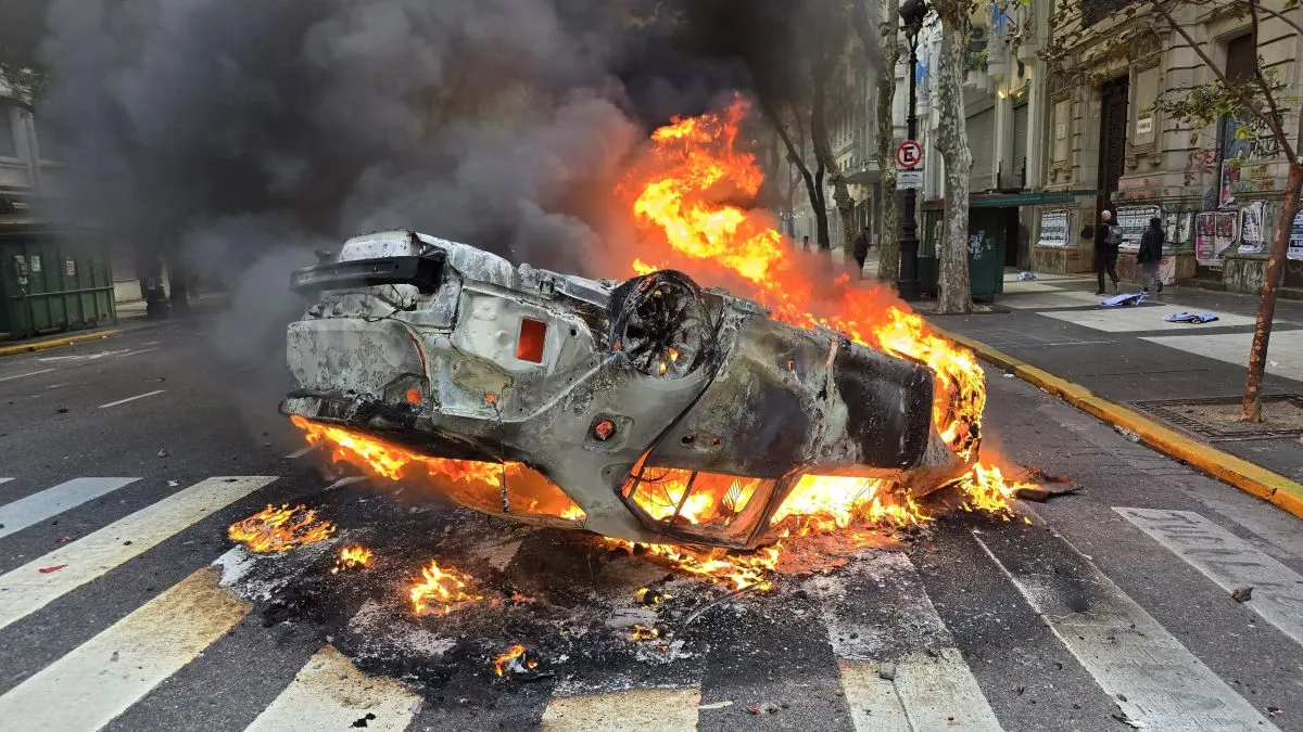 La violencia escaló rápidamente cuando los manifestantes incendiaron dos patrulleros sobre Avenida de Mayo y Santiago del Estero. También destrozaron una moto, un auto particular y rompieron baldosas para utilizarlas como proyectiles. Sobre Avenida Callao y Presidente Perón, formaron una barricada con contenedores en llamas, mientras que negocios y vehículos particulares fueron atacados y saqueados.