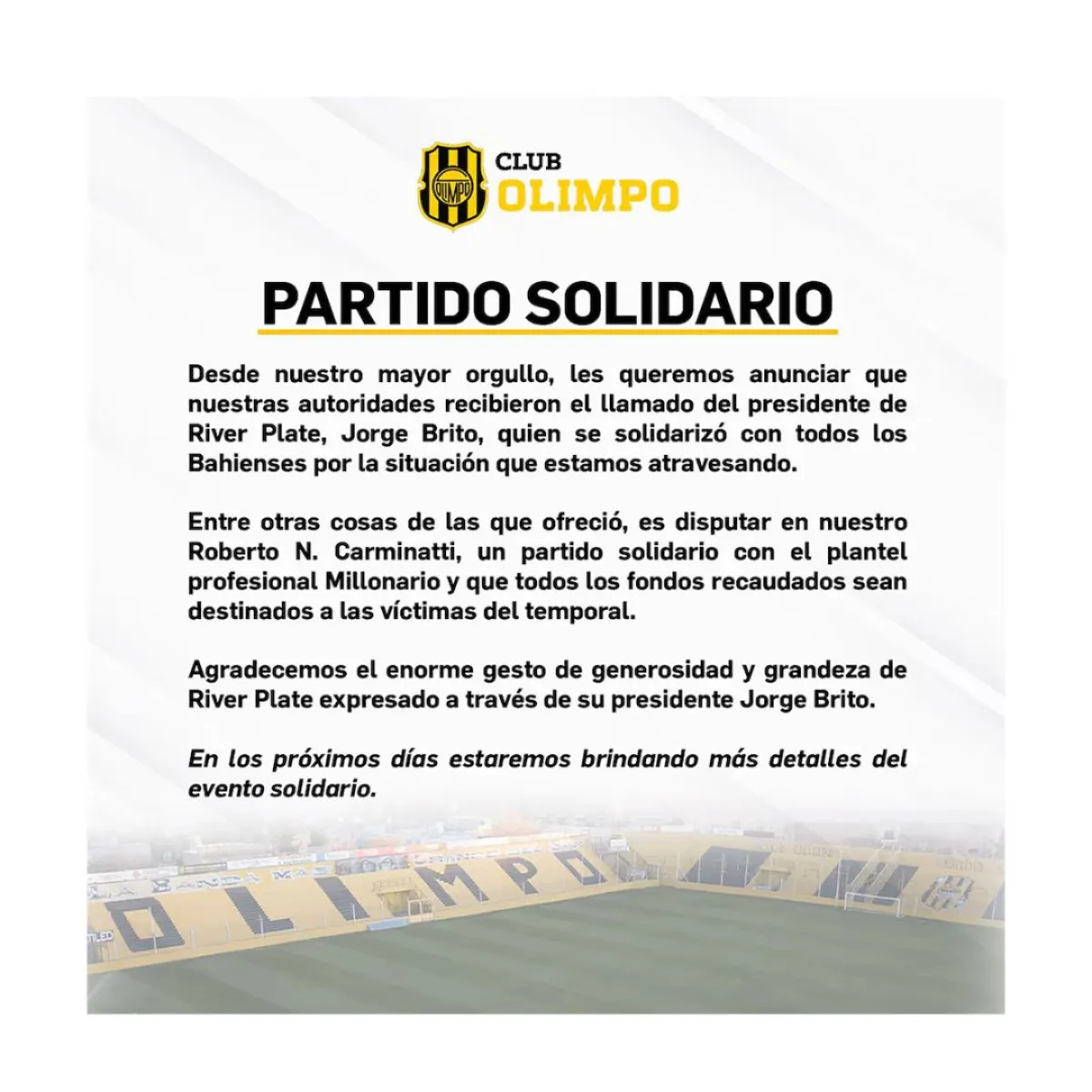 “Desde nuestro mayor orgullo, les queremos anunciar que nuestras autoridades recibieron el llamado del presidente River Plate, Jorge Brito, quien se solidarizó con todos los Bahienses por la situación que estamos atravesando”, expresaron las autoridades de Olimpo mediante un comunicado oficial, confirmando que el evento solidario ha sido encabezado por el presidente del club de Núñez, Jorge Brito.